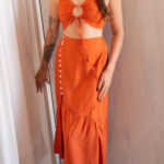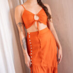 Falda con botones en delantero, boleros y elástico en cintura posterior. top con canal en el busto y cargaderas ajustables.